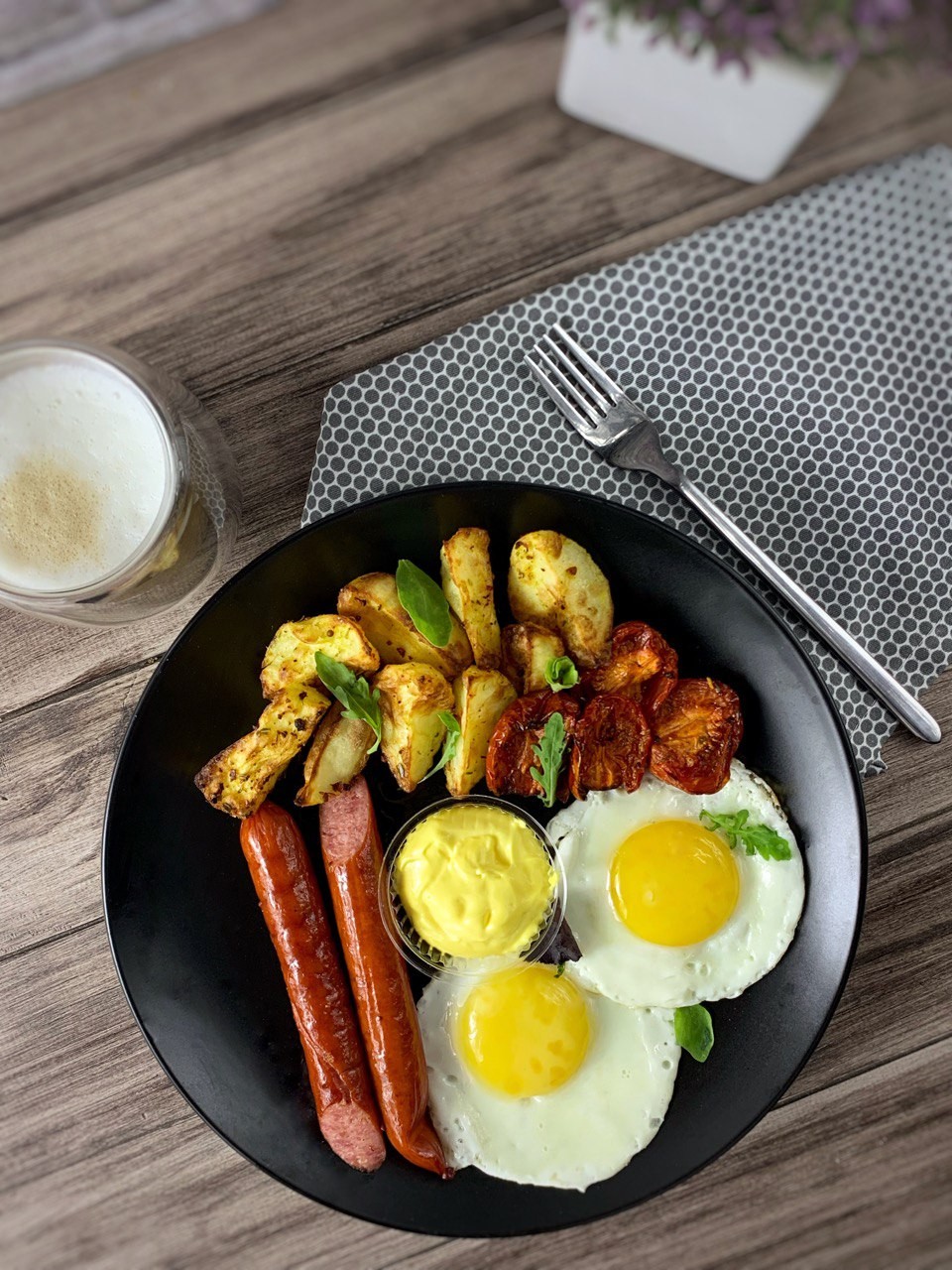Запечена картопля, яєчня 2 шт, мисливські ковбаски,